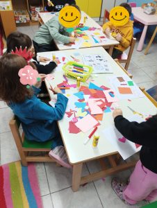 Οι μικροί μας μαθητές, αφού έμαθαν για τον σωστό και ασφαλή χειρισμό του ψαλιδιού, πήραν μπογιές, κόλλες , ψαλίδια και χρωματιστά χαρτιά και δημιούργησαν το πρώτο τους κολάζ! Το αποτέλεσμα εντυπωσιακό!